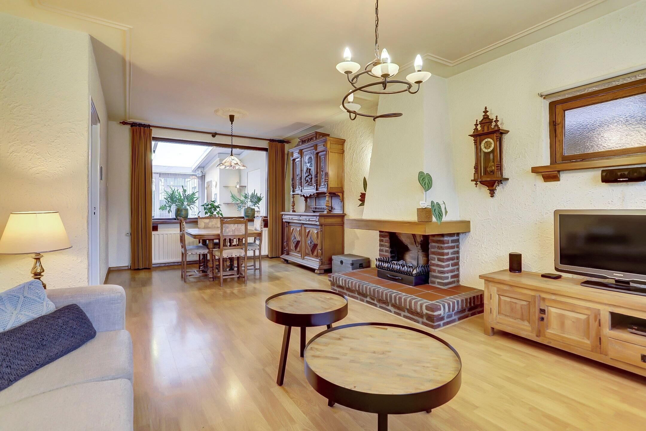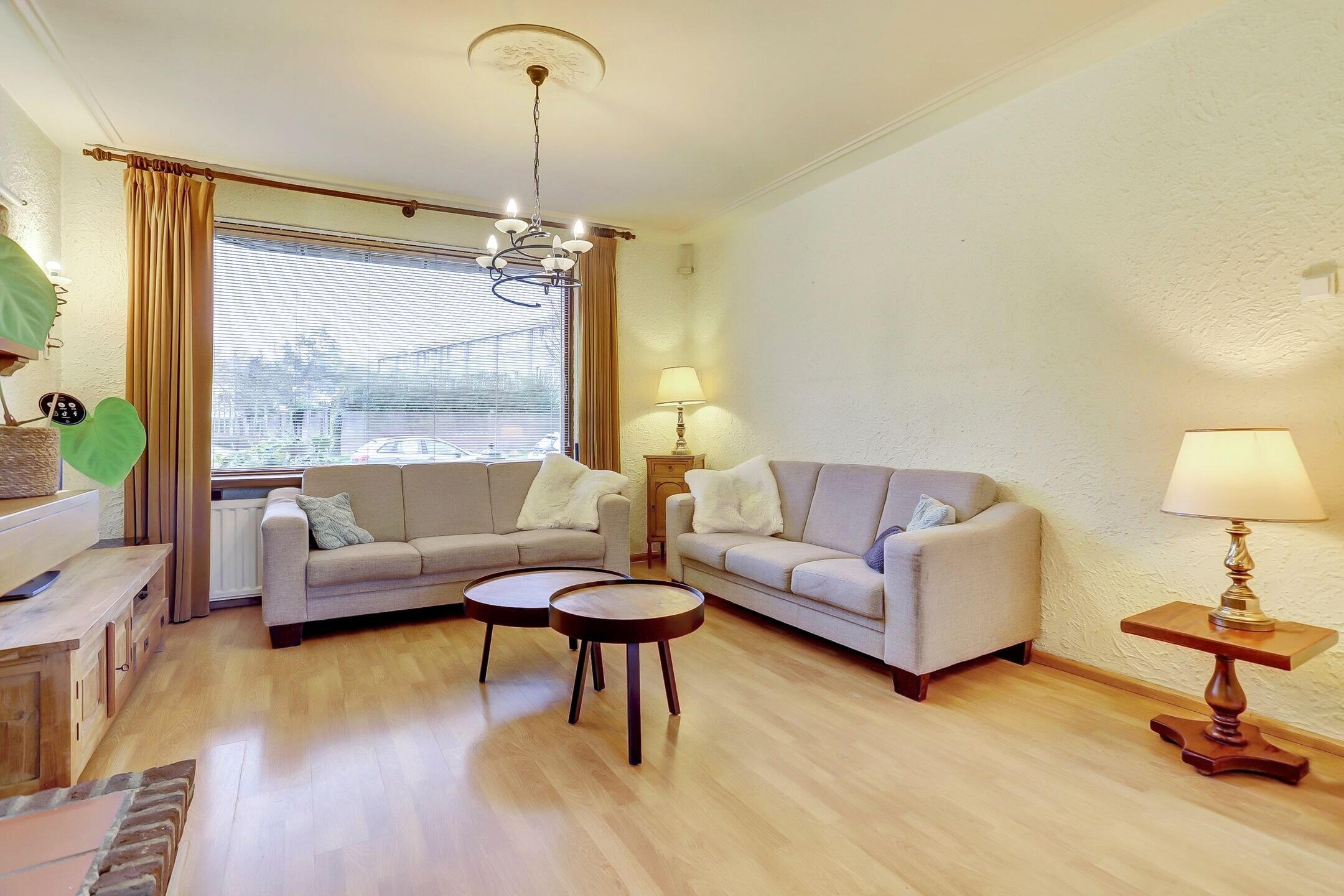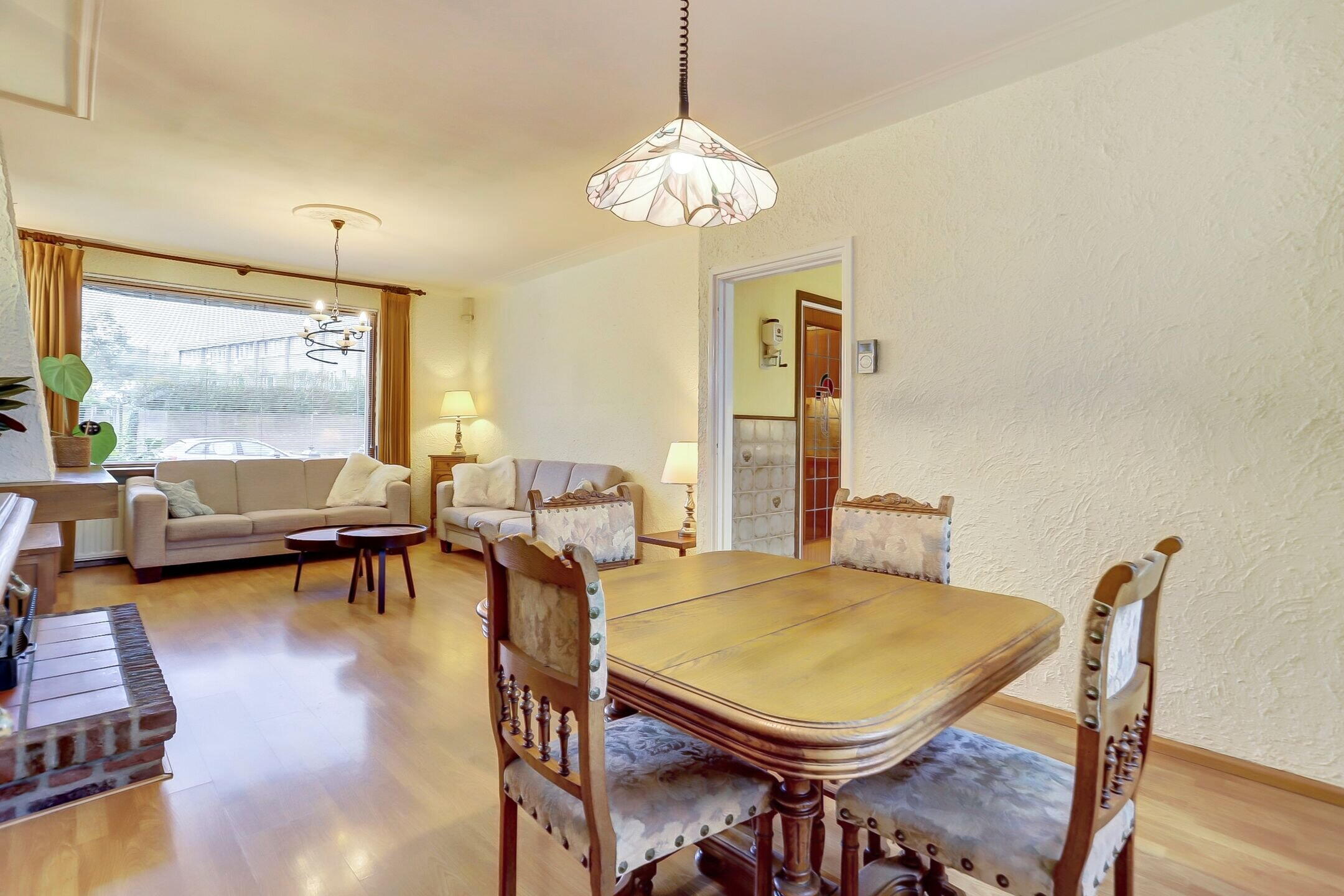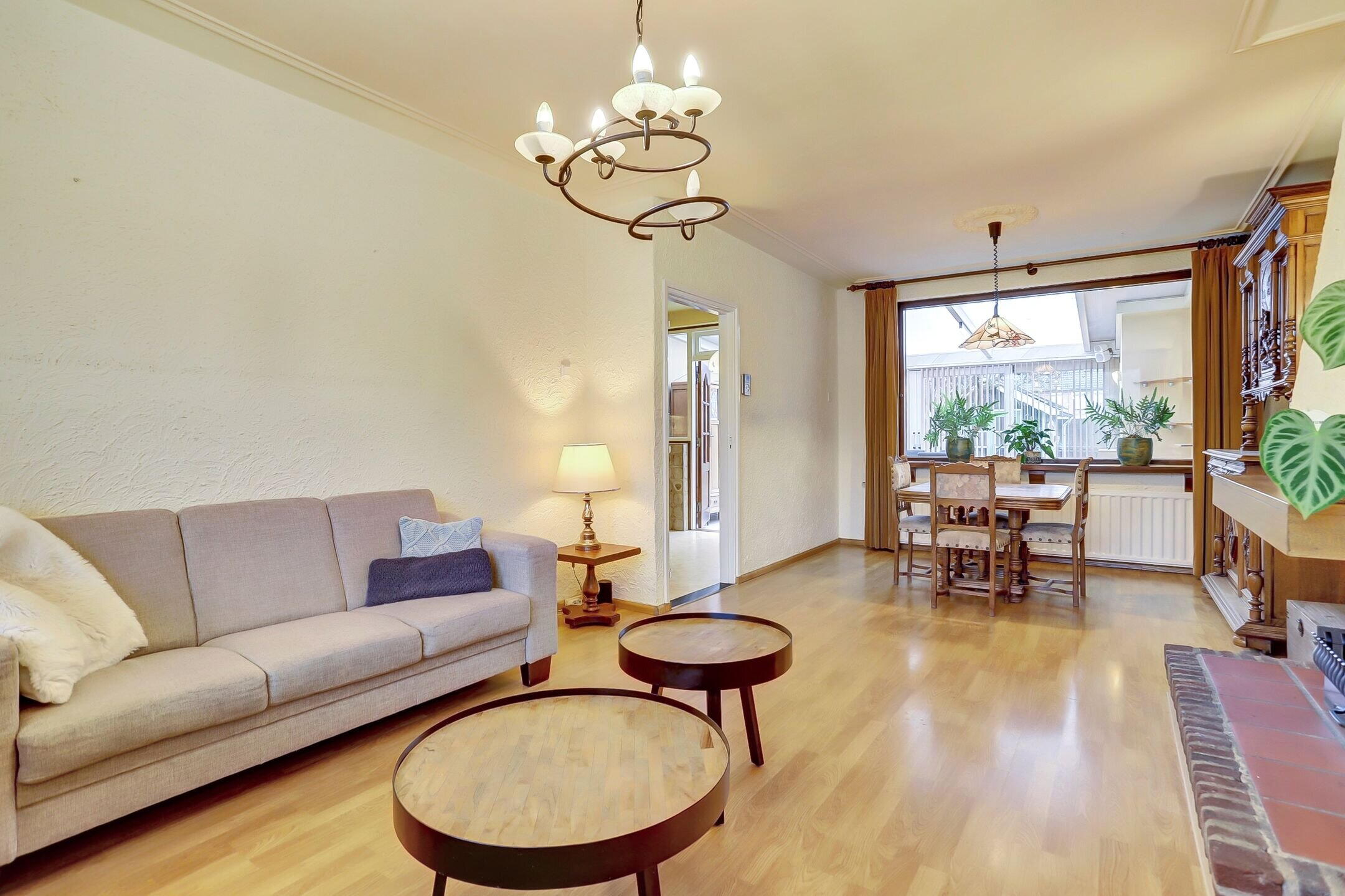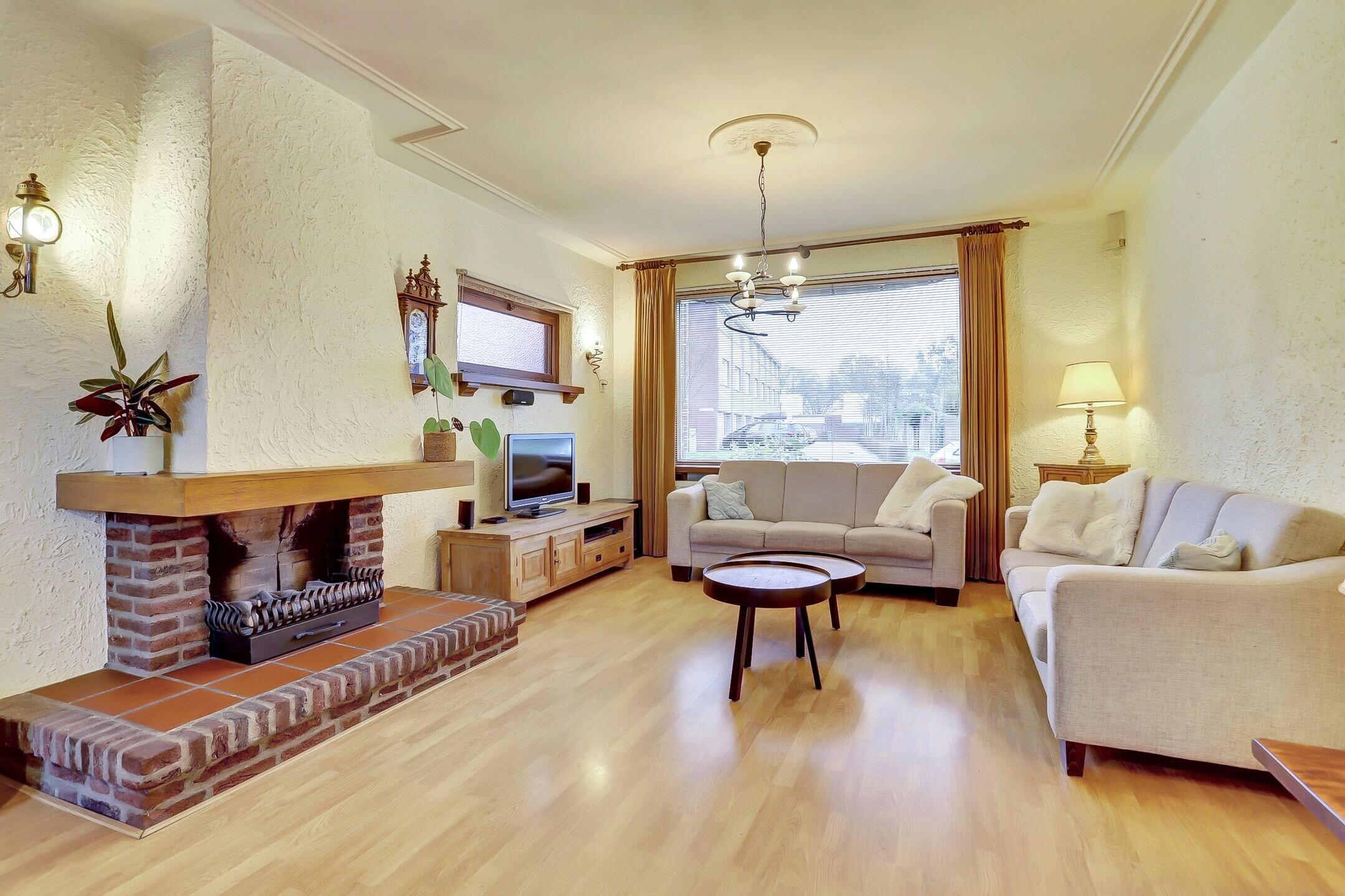 De woonkamer is een fijne, lichte ruimte met grote raampartijen aan de voorzijde en een extra zijraam waardoor het daglicht rijkelijk binnenvalt. Er is een schouw met haard aanwezig; de huidige gashaard is niet meer functioneel maar via het bestaande rookkanaal is het zeker mogelijk om hier opnieuw een haard te realiseren. Op de vloer ligt een lichte laminaatvloer en het plafond is fraai afgewerkt met sierlijsten en ornamenten bij de lichtpunten wat de ruimte een klassieke touch geeft.
