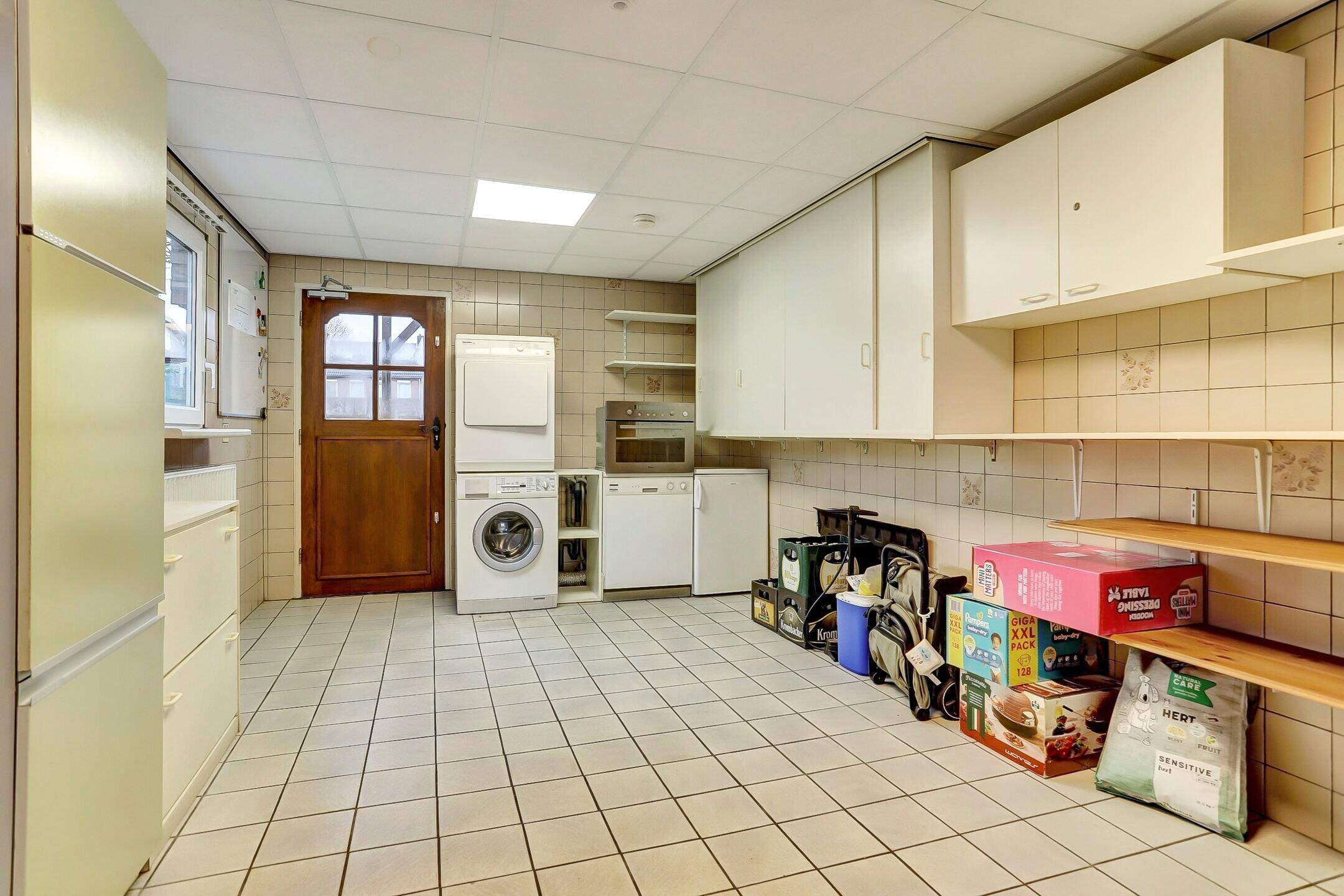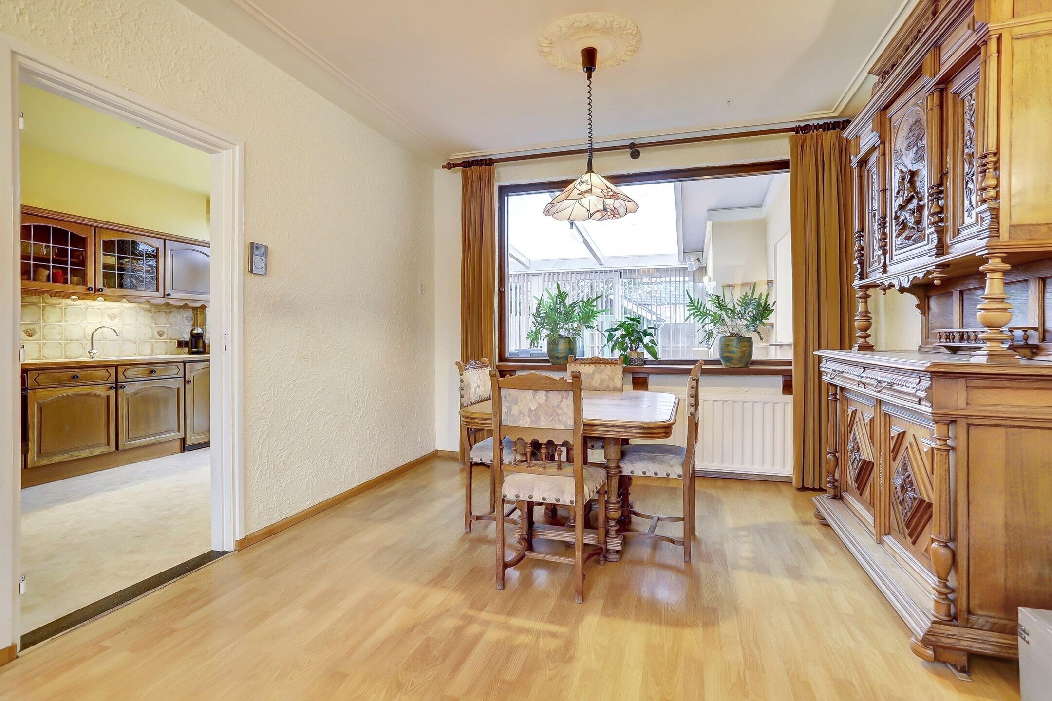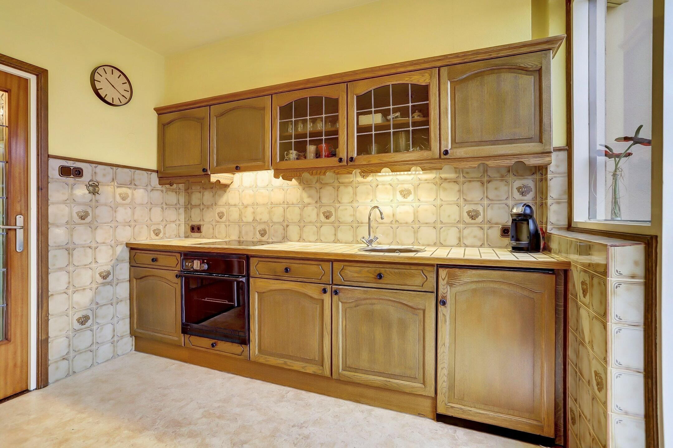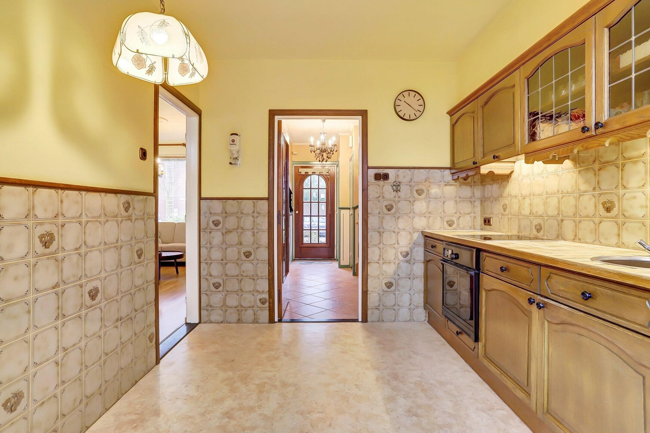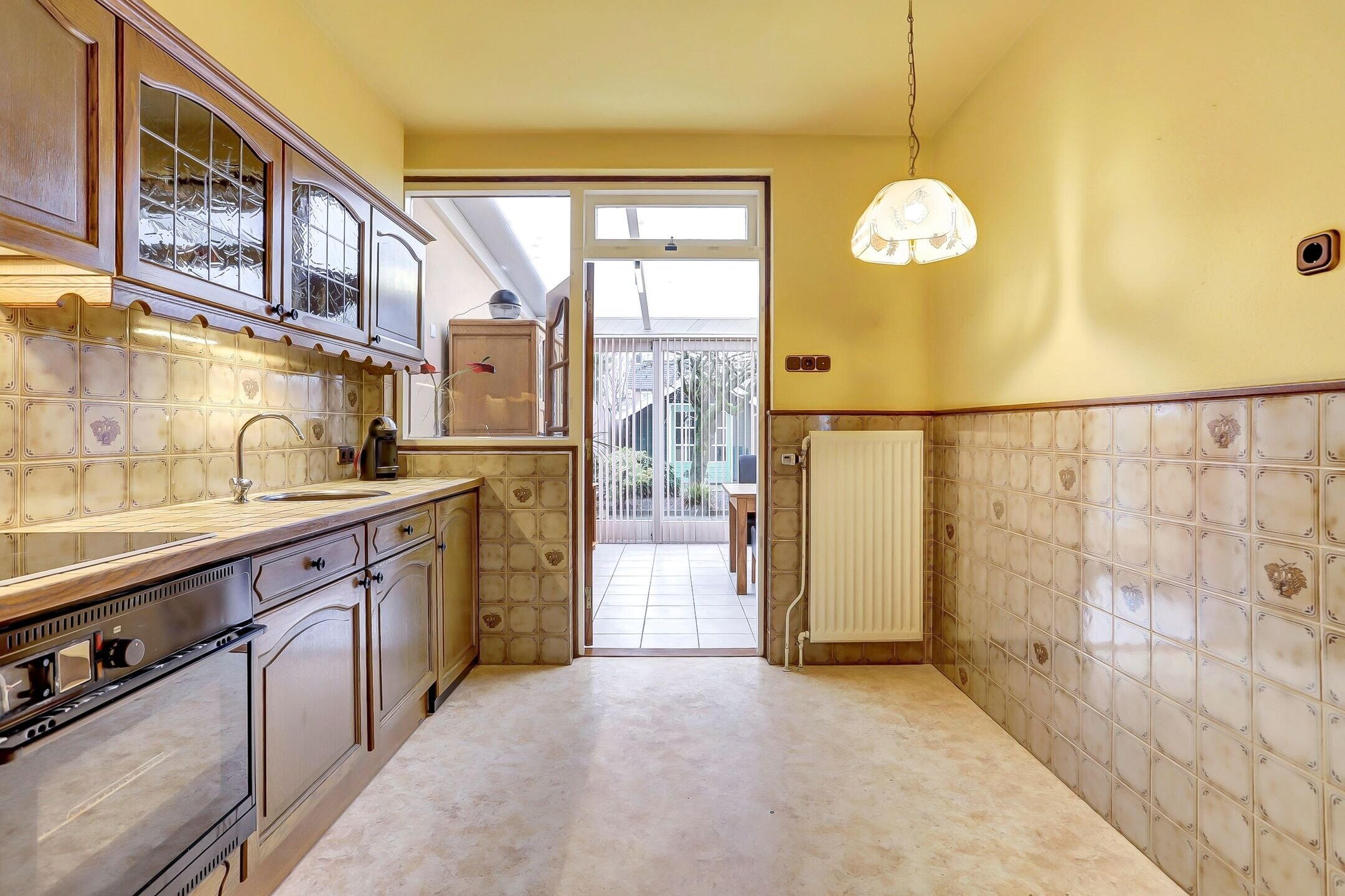 Via een deur met glas-in-lood loop je door naar de keuken. Deze is enigszins gedateerd, maar functioneert prima (met uitzondering van de oven). Je kookt hier op een vierpits inductiefornuis en de vaatwasser is geplaatst in de garage. Dankzij de directe verbinding met de woonkamer en de tuinkamer biedt deze ruimte nog volop mogelijkheden om hier een royale en moderne leefkeuken te realiseren.