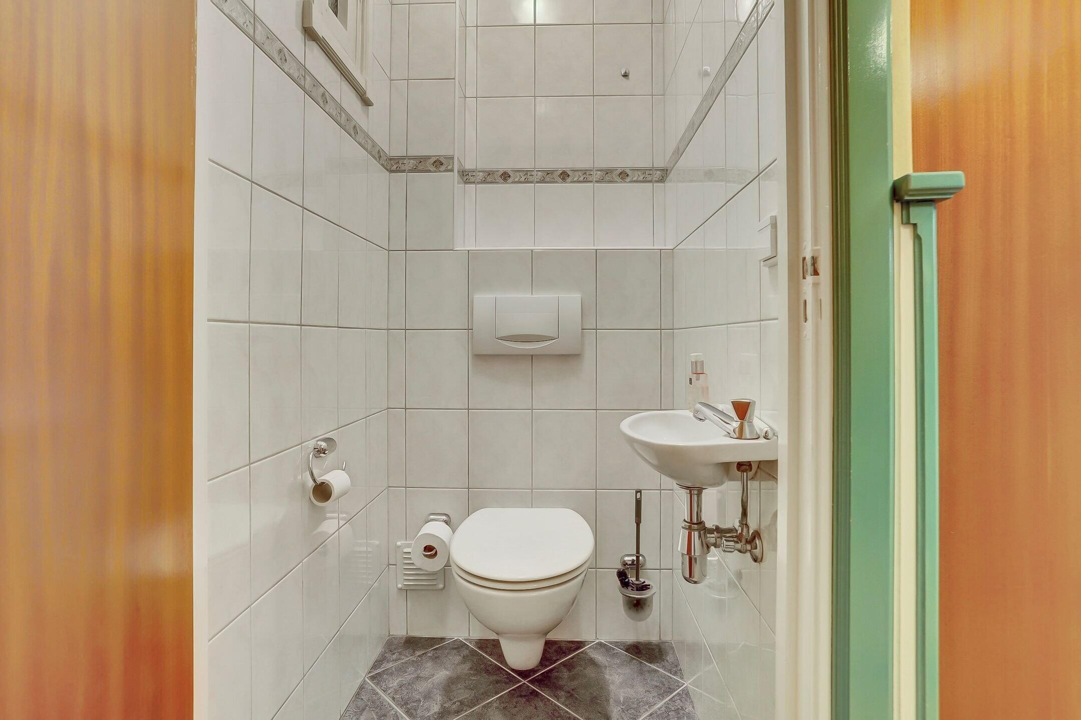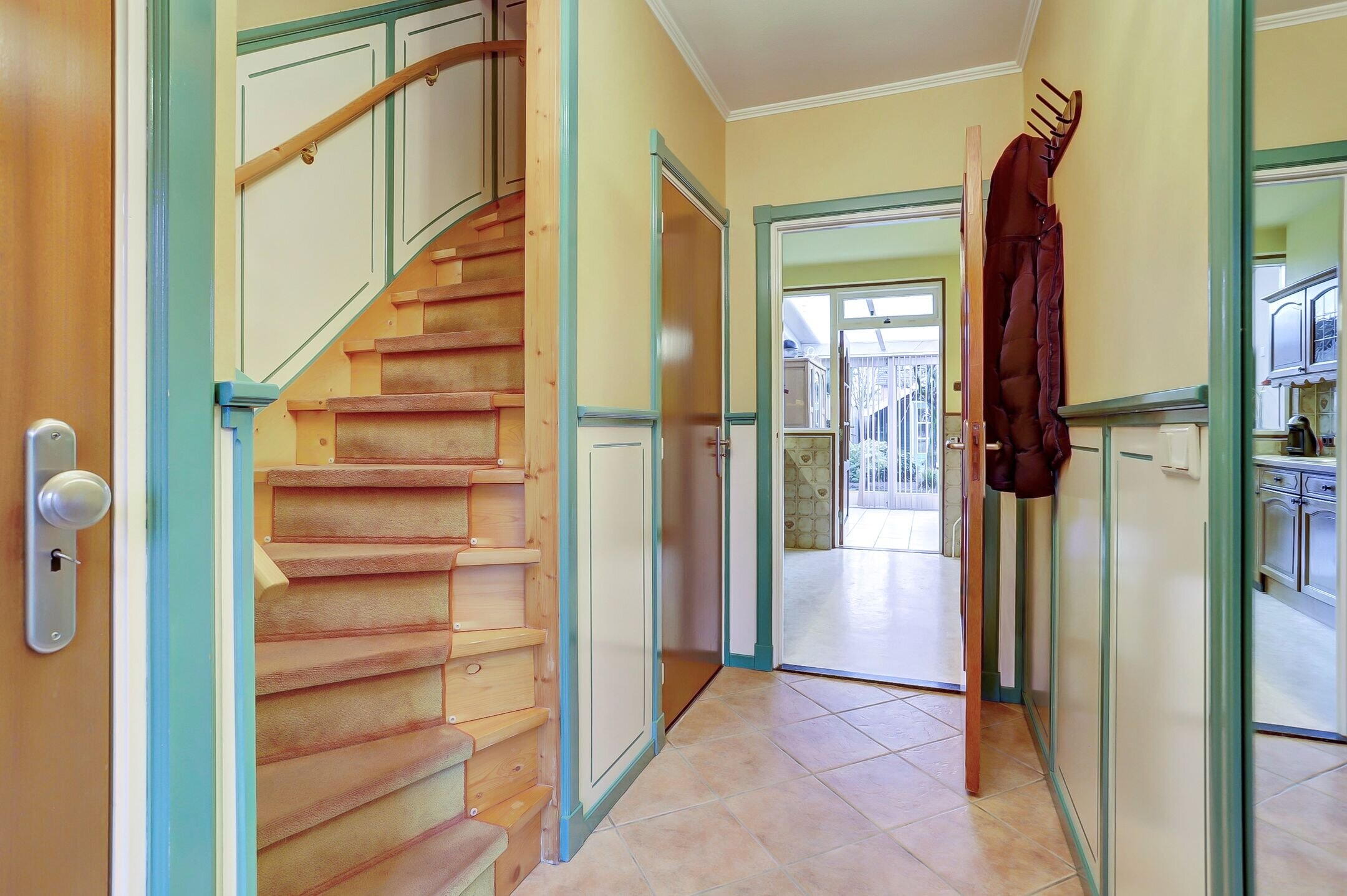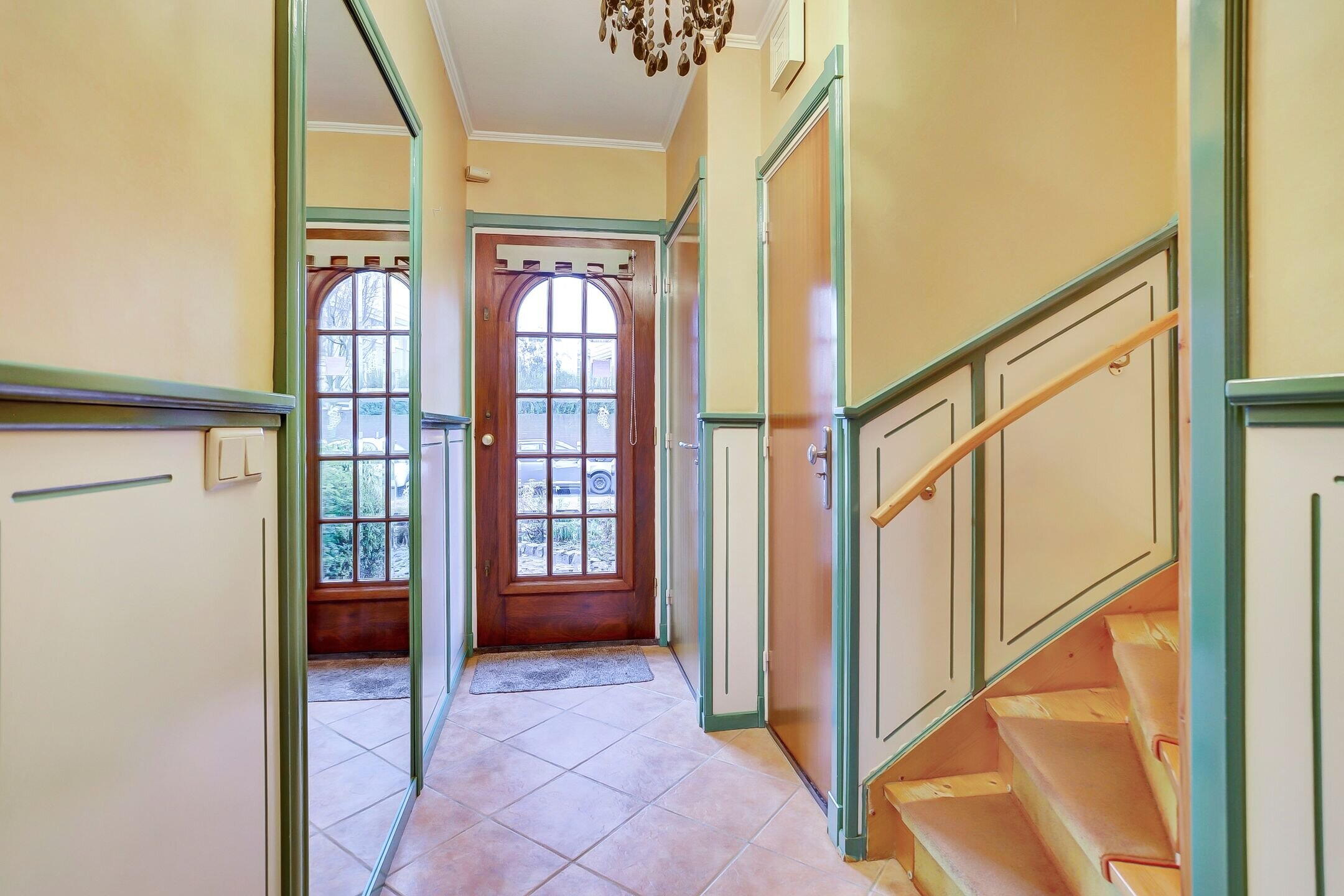 In de hal tref je als eerste de volledig betegelde toiletruimte, uitgevoerd met een wandtoilet en fonteintje. Daarnaast bevindt zich de meterkast, voorzien van een aansluiting op het glasvezelnetwerk. Verderop in de hal is een handige trapkast met verrassend veel bergruimte en toegang tot de kruipruimte. De hal heeft een sfeervolle uitstraling dankzij de lambrisering op de wanden en een plafondhoge spiegel die de ruimte extra licht en ruimtelijk maakt.