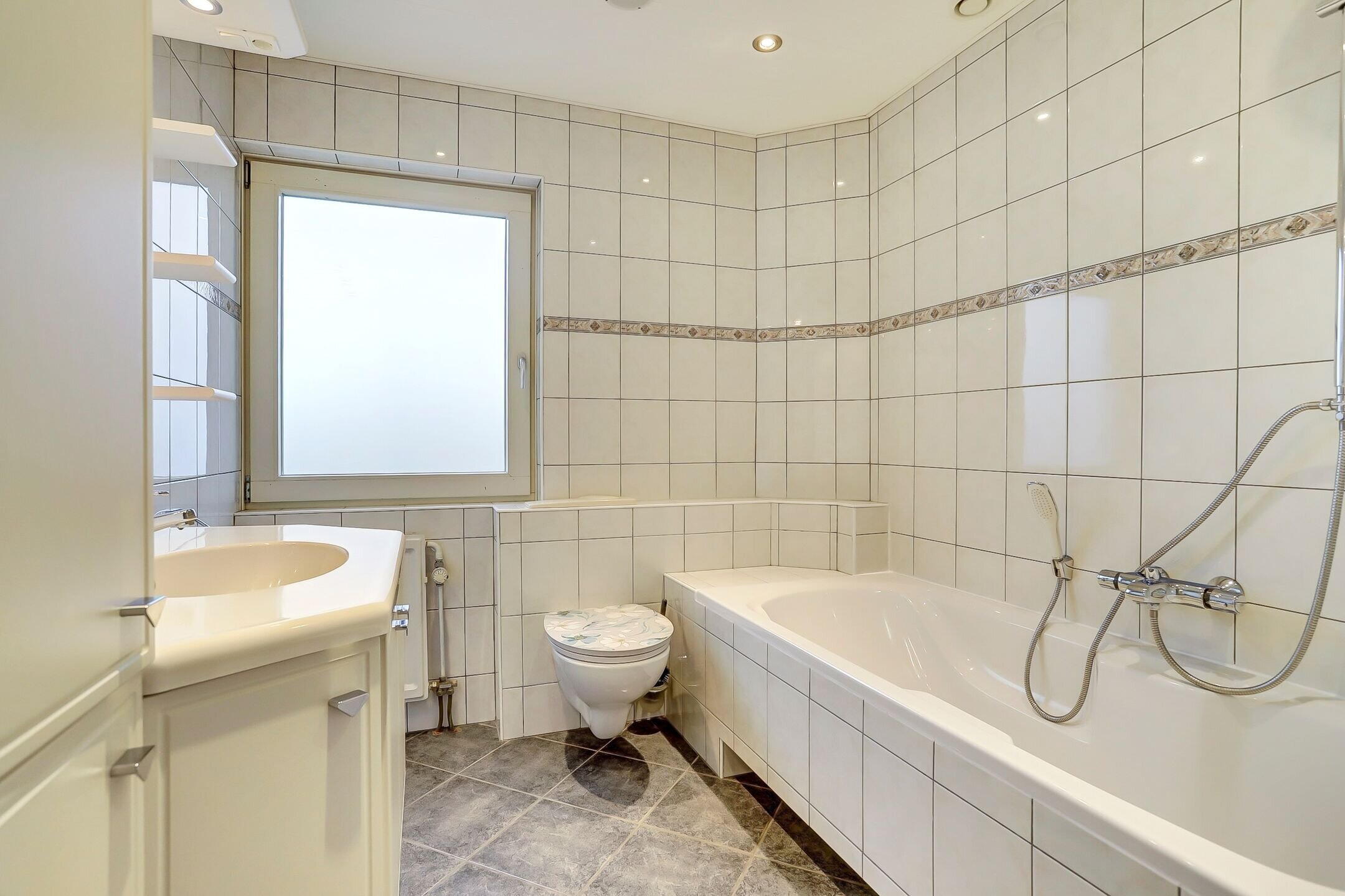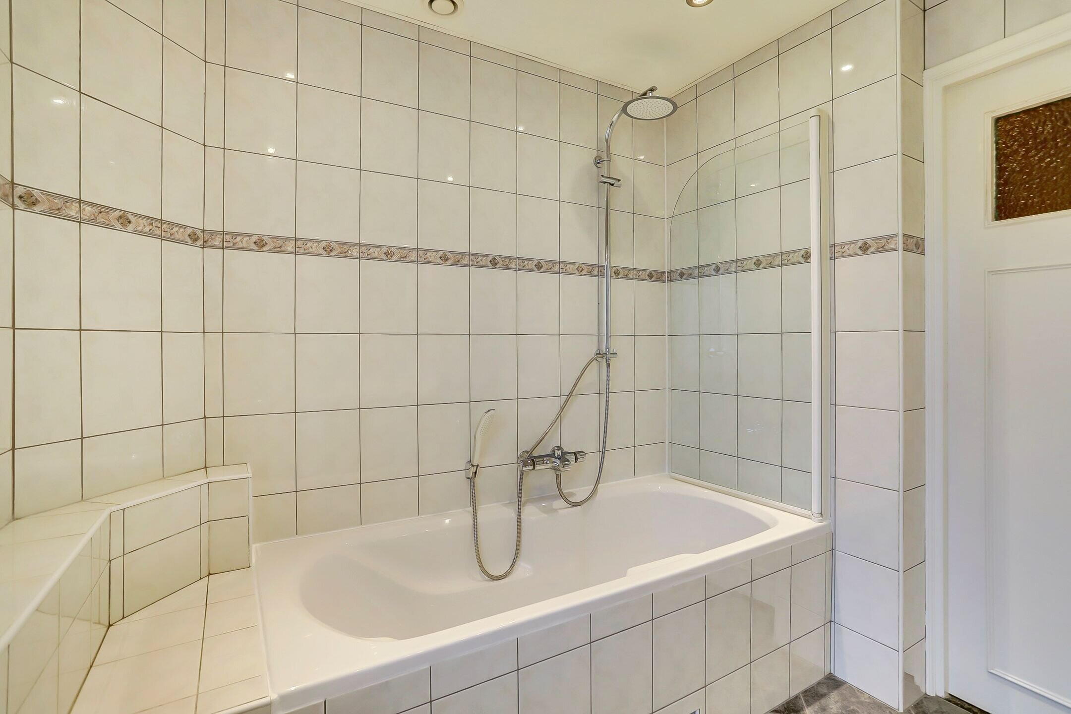 De badkamer is functioneel en comfortabel ingericht. Er is een ligbad aanwezig met een wegklapbare glazen wand waardoor je hier ook uitstekend kunt douchen zonder dat de hele ruimte nat wordt. De wastafel is gecombineerd met een groot opbergmeubel wat volop bergruimte biedt en boven de spiegel zorgen inbouwspotjes voor prettige verlichting. Daarnaast is de badkamer uitgerust met een wandtoilet. Ventileren kan zowel natuurlijk via het draaikiepraam met melkglas (hierdoor heb je wel optimaal lichtinval maar nooit inkijk) als mechanisch via de automatische afzuiging. De badkamer is uitgevoerd in een neutrale en tijdloze stijl met lichte wandtegels voorzien van een sierrand en een donkere vloertegel. Extra comfort wordt geboden door de vloerverwarming.