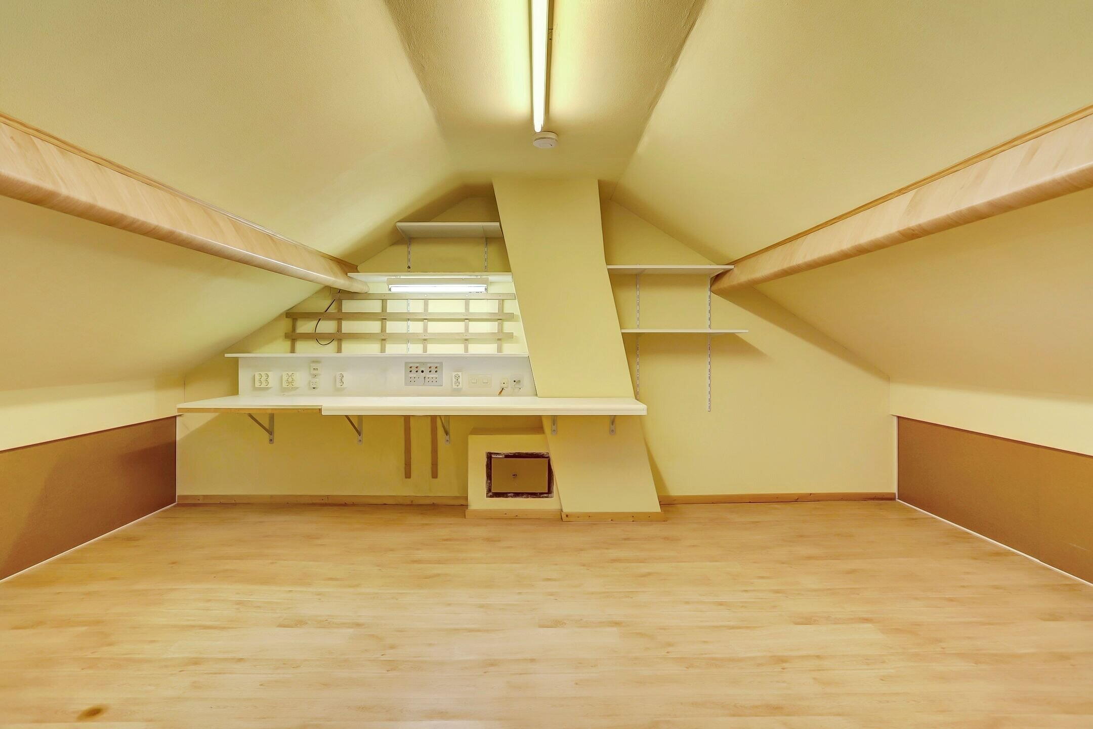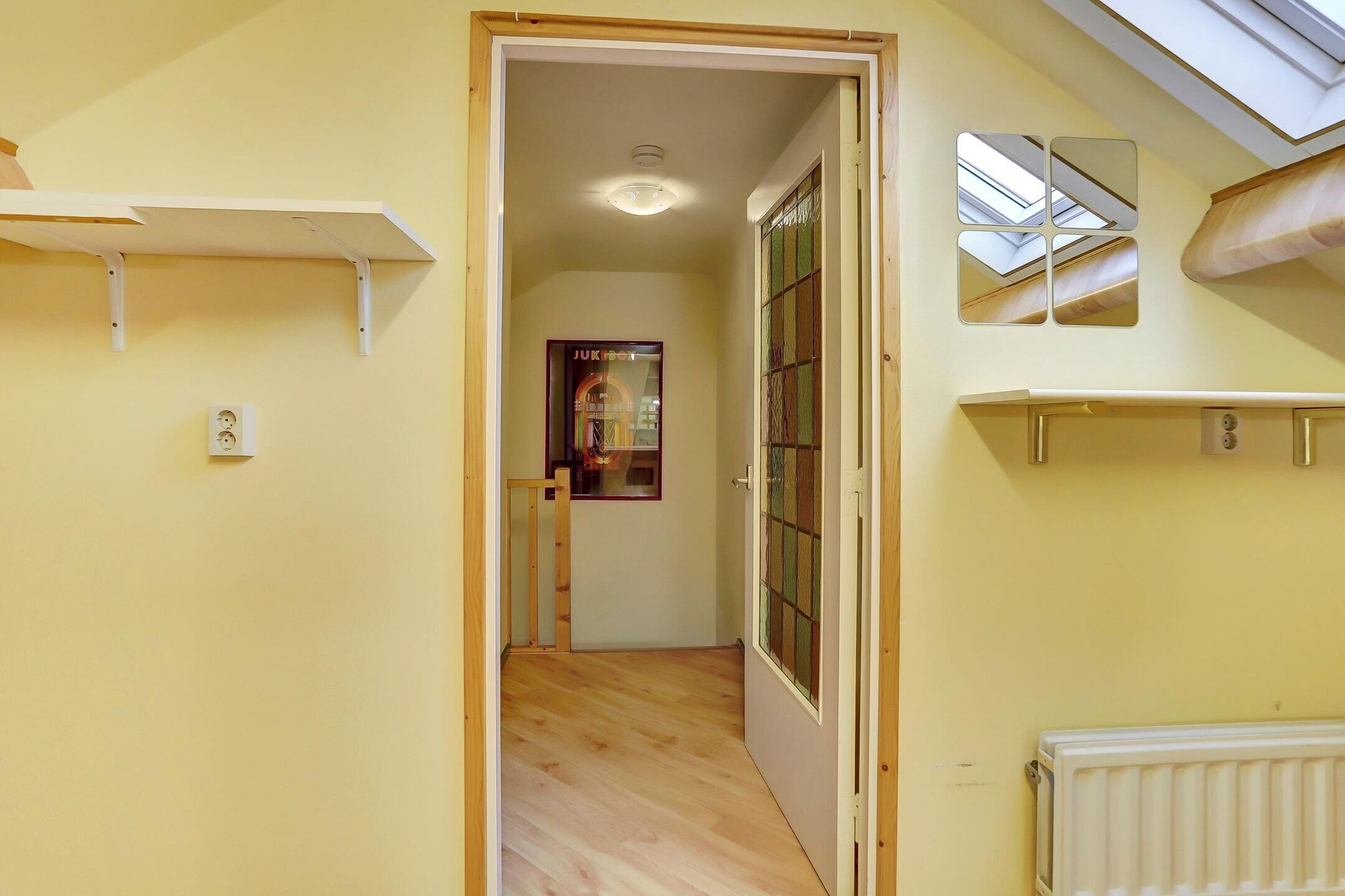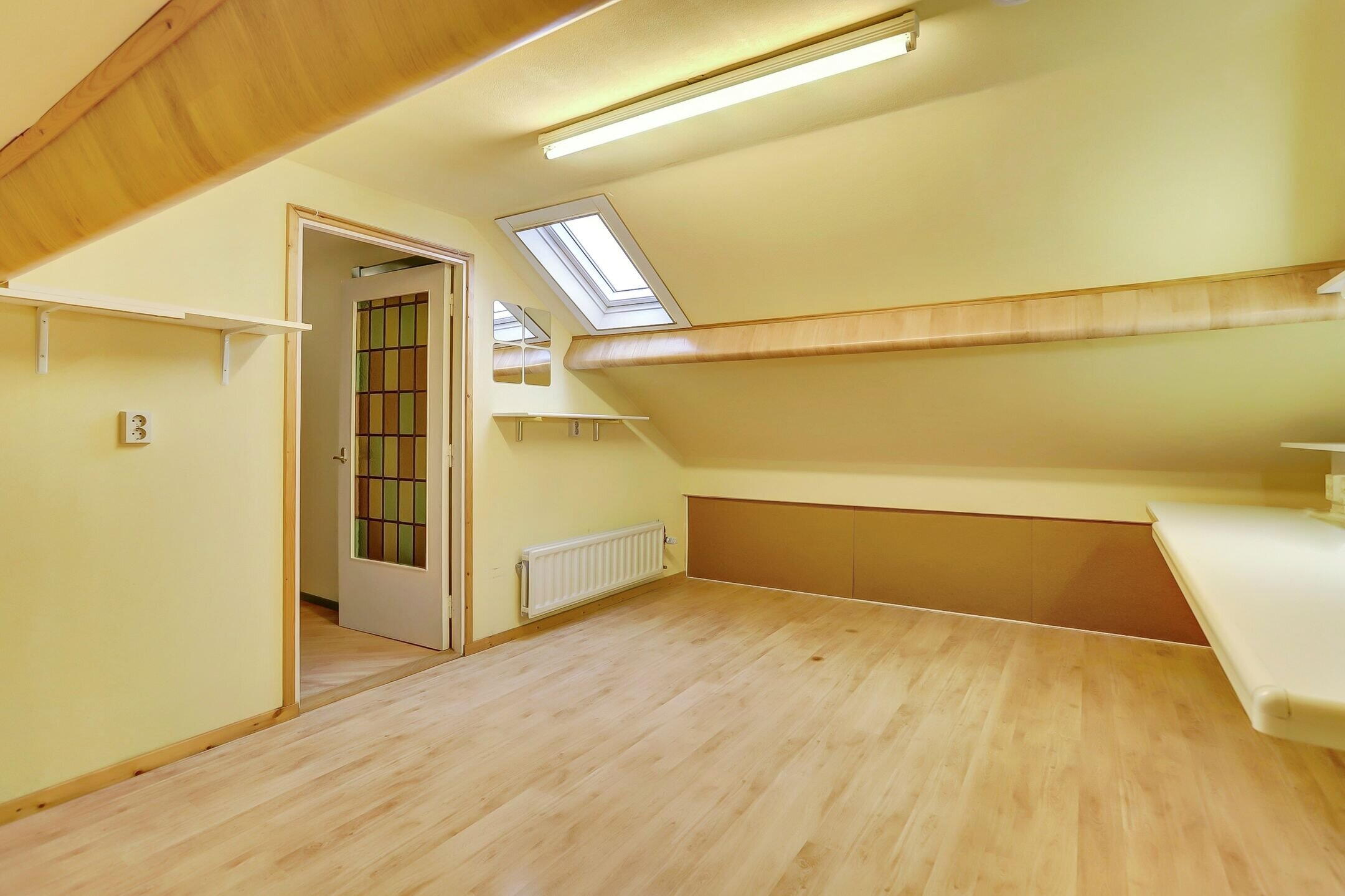 Dankzij het Velux dakraam is er sprake van prettige natuurlijke lichtinval wat de ruimte aangenaam en goed bruikbaar maakt. Onder de schuine dakvlakken zijn praktische bergkasten met schuifwanden gerealiseerd waardoor je hier verrassend veel spullen netjes uit het zicht kunt opbergen. De zolder is afgewerkt met een vinylvloer wat zorgt voor een rustige en onderhoudsvriendelijke uitstraling.