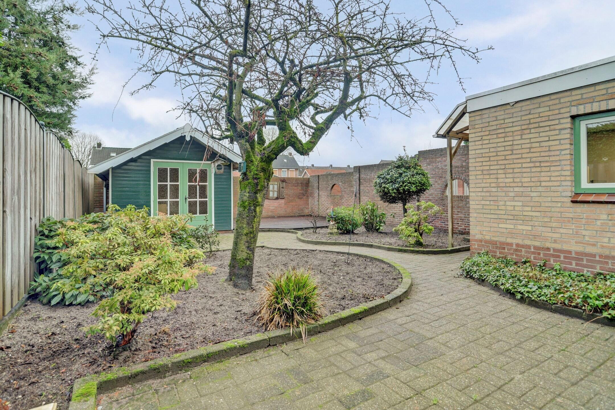 De tuin is gunstig gelegen op het oosten en biedt een fijne combinatie van zon, schaduw en privacy. Direct achter de woning bevindt zich een beschut terras, een heerlijke plek om ’s ochtends of overdag rustig buiten te zitten en te genieten van de tuin. Achter in de tuin is een tweede terras op houten vlonders aangelegd. Hierdoor is er altijd wel een prettige plek te vinden: in de zon of juist in de schaduw. De absolute blikvanger is de prachtige Japanse kersenbloesem die in het voorjaar de tuin siert met een overvloed aan roze bloemen en bloesem. De borders zijn gevarieerd aangeplant met verschillende planten en bloemen waardoor er gedurende het jaar steeds iets in bloei staat. In het houten tuinhuis is voldoende ruimte voor het opbergen van tuingereedschap en tuinmeubilair. Op het dak van dit tuinhuis liggen vier zonnepanelen, een mooie duurzame toevoeging. De tuin is volledig omheind, deels met een stenen muur en deels met een schutting, waardoor kinderen en huisdieren hier veilig kunnen spelen. Daarnaast is de tuin voorzien van verlichting en meerdere stopcontacten wat het gebruiksgemak vergroot. De waterkraan bevindt zich in de garage die een praktische verbinding vormt tussen woning en tuin.