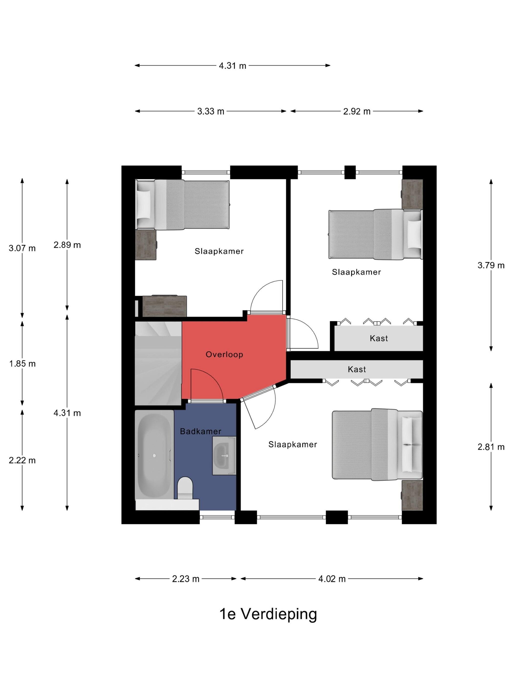 De eerste verdieping is praktisch en comfortabel ingedeeld en beschikt over drie ruime slaapkamers en een fijne, complete badkamer.